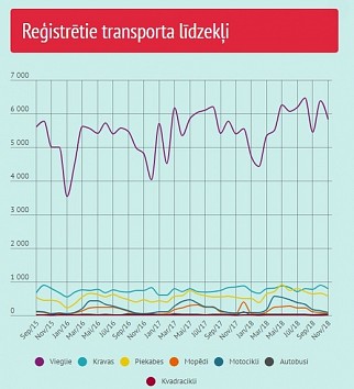 Tāpat 2018.gada 11 mēnešos iegrāmatoti 8653 kravas auto, kas ir par 7,9% vairāk nekā gadu iepriekš, 325 autobusi, kas ir sarukums par 3,3%, kā arī 2987 motocikli un tricikli, kas ir pieaugums par 19%.