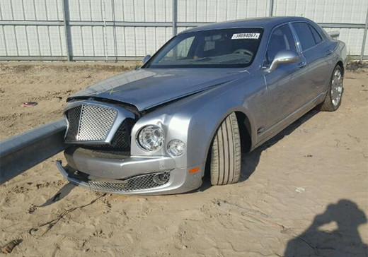 ASV pārdošanā izlikts 2011.gada "Bentley Mulsanne", kas pamatīgi cietis avārijā, uztriecoties ceļa aizsargbarjerai.