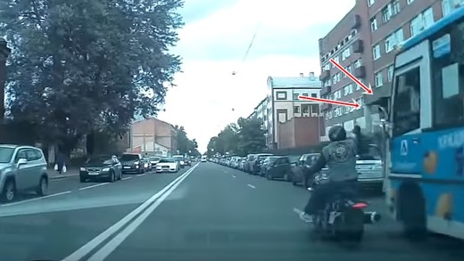 Aizvainots par to, ka autobuss nogriež tam ceļu, baikeris sadauza sabiedriskā transporta spoguli un aizbrauc.