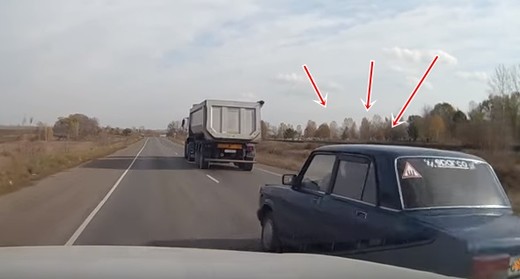 Žigulīša vadītājs uzsāk apdzīšanu nepaskatoties spoguļos, kā rezultātā pats visvairāk arī cieš (no 0:23).