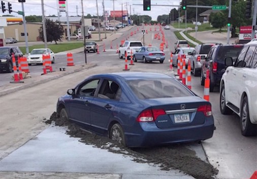 Deviņpadsmit gadus vecais autobraucējs no Nebraskas droši vien vēl ilgi nožēlos savu pārsteidzīgo lēmumu apbraukt satiksmes korķi pa tikko uzlietu betonu, kas viņam izmaksās apaļu summiņu.