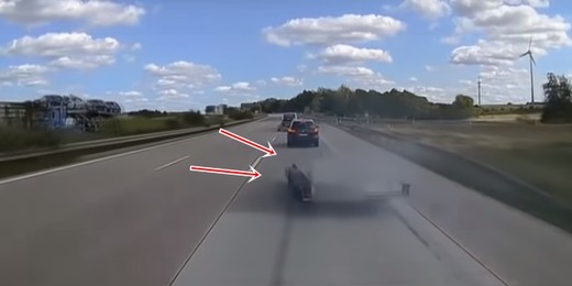 Atāķējusies piekabe izraisa nopietnu avāriju uz autobāņa (+ VIDEO)