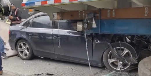 Audi paskrien zem kravas auto, pasažieri gūst nelielus ievainojumus (+ VIDEO)