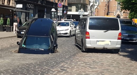Šodien, 5.jūnijā Rīgā, Ģertrūdes ielā bija redzams neparasts skats - automašīna, kas ar degunu "ieurbusies zemē".