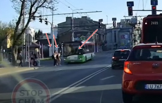 Autobusa šoferis Polijas pilsētā Ļubļanā gandrīz sabrauc cilvēkus uz gājēju pārejas, taču policija to redz un satiksmes transportlīdzeklis tiek nekavējoši apturēts.