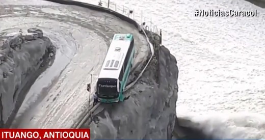 Mēģinot izbraukt serpentīnu, kas ved no 225 m augstā Ituango (Kolumbija) dambja, šoferis pieļauj kļūdu un tūristu autobuss uzkaras uz klints malas virs trakojošās Kaukas upes.