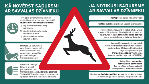 Lai izvairītos no iespējama ceļu satiksmes negadījuma, aicinām autovadītājus būt uzmanīgiem, kā arī ievērot ceļa zīmes, kas attiecīgajos ceļu posmos norāda par iespējamu meža dzīvnieku klātbūtni. Tāpat vēršam uzmanību, ka meža dzīvnieki mēdz pārvietoties arī baros un to uzvedība nav paredzama, tāpēc jāievēro īpaša piesardzība.