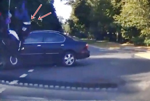 Motociklists saduras ar automobili un paliek uz tā jumta.Video beigas pazūd aiz kadra, taču, šķiet, ka sadursme ir veselībai bez sekām un apmetot salto, motociklists paliek uz mašīnas jumta stāvus.