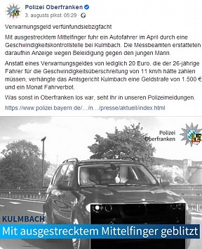 Sods par ātruma pārkāpumu būtu vien 20 eiro, taču „sveiciens policijai” tika iztulkots kā likumsargu apvainošana, tādēļ Kulmbahas apgabaltiesa vīrietim piesprieda naudas sodu 1500 eiro apmērā un pasludināja braukšanas aizliegumu uz vienu mēnesi.
