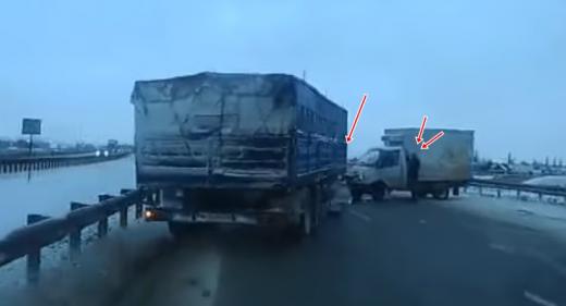 Kravas auto piekabe saslīd un gandrīz uztriecas nelielam kraviniekam, kas mirkli pirms tam cietis avārijā.