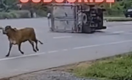Cenšoties izvairīties no sadursmes ar govi, vadītājs "nogulda" kravinieku uz sāniem.