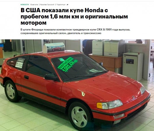 Tampas (ASV) pilsētas Honda dīleris savās telpās izlicis apskatei apbrīnojami izturīgu Honda CRX Si kupeju, kas ražota 1991.gadā. Tiek ziņots, ka šim automobilim, kas noskrējis 1 002 473 miljonus jūdžu (vairāk nekā 1,6 miljoni km), saglabājis oriģinālo salonu, dzinēju un transmisiju.
