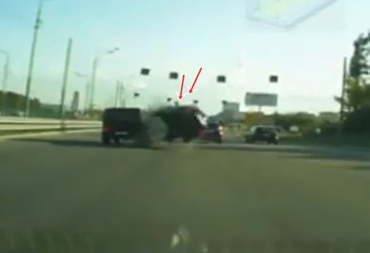 Hyundai, kas filmētāju apsteidz pa labo pusi, vēlas ieņemt kreiso malējo joslu, bet Mercedes apvidnieks tieši tobrīd virzās pa labi.