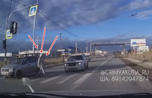 Zem kapuces paslēpusies sieviete neskatoties dotas pāri gājēju pārejai un šoreiz tiešām izdzīvo (no 0:25).