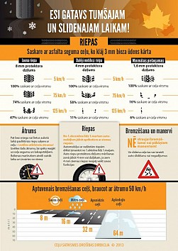 Grafiki uzskatāmi parāda, kā labāk sagatavoties braukšanai ziemā, tumšā un aukstā laikā, kā arī informē par drošai ceļu satiksmei nepieciešamajām lietām.
