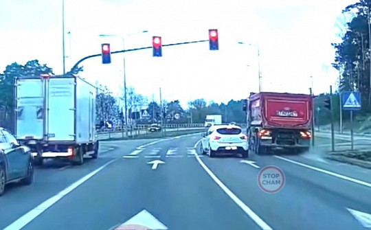 Pie krustojuma, kurā iedegas aizliedzošais signāls, kravas auto šoferis nebremzē, bet nolemj apbraukt vieglo auto un doties tālāk. Iespējams, viņu samulsināja vieglā auto vadītājs, kurš bremzē pēdējā mirklī un apstājas uz pārejas.