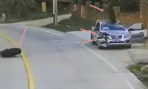 Divas riepas, kas atdalās no garāmbraucoša kravas auto nodara pamatīgu skādi šosejas malā stāvošajam pikapam - pirmā taranē pikapa labo priekšējo stūri, liekot izšauties gaisa spilveniem, bet otra sadragā jumtu un vējstiklu, piespiežot vadītāju glābiņu meklēt bēgot.