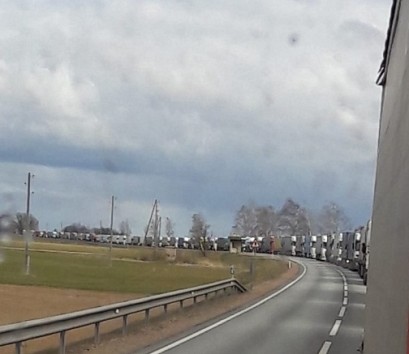 Foto autors apgalvo, ka nezina, kas darās uz robežas, taču, pēc viņa teiktā kravinieku rinda, kas gaida izbraukšanu no Latvijas uz Lietuvu izstiepusies "teju līdz Bauskai". Pulksten 15.50 rindas garums palielinājies par 2,5 km, taču tagad zināms, ka tā veidojas tādēļ, ka šoferiem tiek mērīta temperatūra un jāaizpilda anketa. Tiek ziņots, ka nostāvot 2,5 stundas, rinda pavirzās uz priekšu par aptuveni 6,5 km.