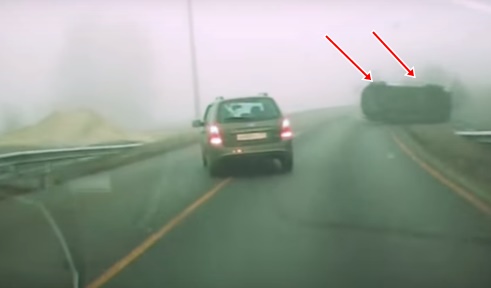Video autors un viņam priekšā braucošais spēkrats izvairās no vieglā auto, kas, metot kūleņus, draud uzgāzties viņiem virsū.