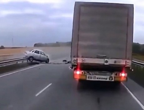 Apdzīšanas manevra laikā saduras divi vieglie automobiļi, kam nekavējoties pievienojas filmētājs, kurš nespējot nobremzēt, ietriecas kravinieka aizmugurē.