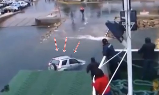 Krosovers sāk braukt jau tad, kad prāmja platforma vēl tikai nolaižas. Rezultātā auto iegāžas ūdenī, taču, šķiet, ka vadītājam veicas - viļņi šūpo mašīnu tuvāk krastam un arī palīgi kājas mērcēt nebaidās.