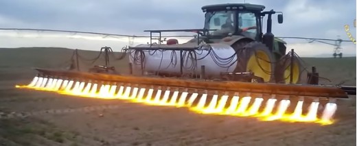 Labākas ražas vārdā un cīņai ar nezālēm tiek izmantots savdabīgs liesmumetējs, kas uzkabināts lauksaimniecības traktoram.