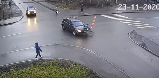 Velosipēdists izmisīgi bremzē, taču kontakts ar automašīnu tomēr notiek un, šķiet, ka no traumas neizbēgt.