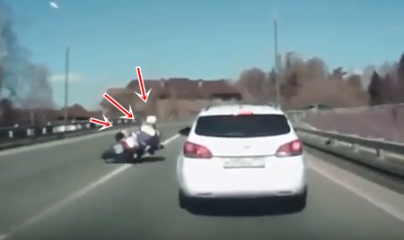 Video no ASV. Izbraucot uz galvenā ceļa, moto patruļas policists pārāk strauji uzdod "gāzi" un nogāžas ar savu divriteņu braucamrīku automašīnas ceļā. Par laimi policistam, vieglā auto šoferis ir uzmanīgs un paspēj nobremzēt.
