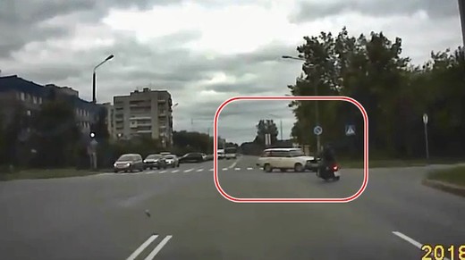 Motociklists ļoti steidzas un saduras ar vieglo automobili, kura šoferis, izpildot kreiso pagriezienu, kā liekas, arī ļoti steidzas.