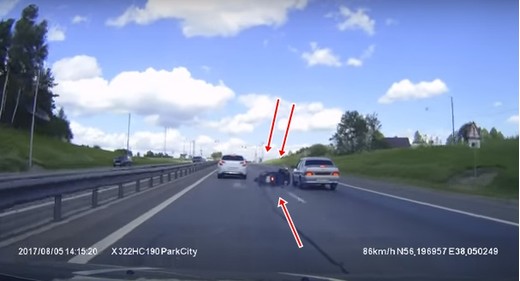 Motociklists brauc starp rindām un sabaidīts no autovadītāja manevra, strauji bremzējot, krīt. Puisim paveicas, jo daudz netrūkst, ka pēc kritiena viņa galva būtu nonākusi zem blakus braucošām mašīnas riteņiem.