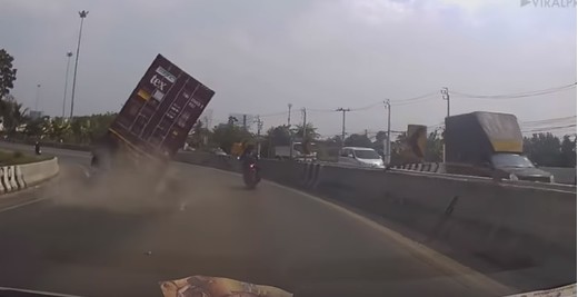 Motociklists gatavojas apsteigt konteinervedēju pa labo pusi, taču ieraugot, ka tas sāk svērties, nobremzē un izglābj savu dzīvību.