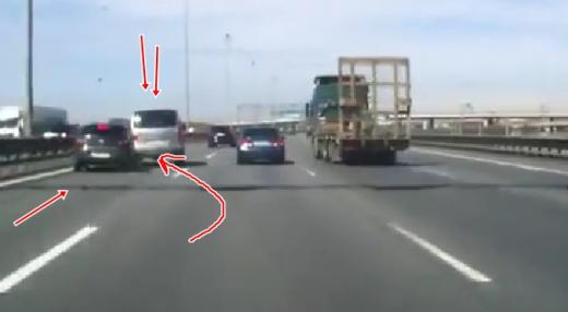 Minivens, kas lavierē starp rindām negaidot iebrauc atpakaļ kreisajā joslā, neatstājot variantus vieglajam auto. Rezultātā cieš pats un tas, kurš nepaguva nobremzēt.