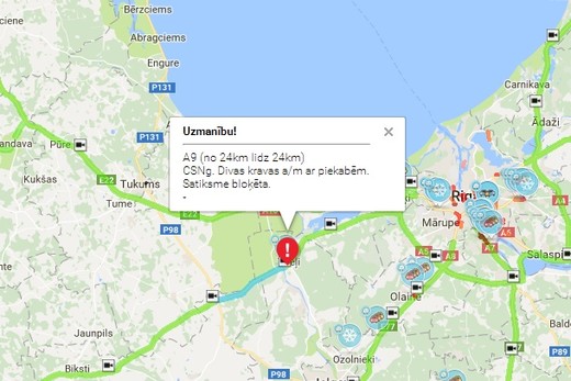 Prognozējams, ka satiksme šajā Liepājas šosejas posmā būs bloķēta vēl aptuveni trīs stundas.
