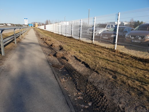 Iesūtītajos attēlos redzams, ka zaļā zona blakus žogam šobrīd izskatās visai nepievilcīga – velēna uzplēsta un melnajā zemē, kur drīz vien vajadzētu izdīgt zālei, tagad rēgojas tehnikas atstāti riepu nospiedumi.