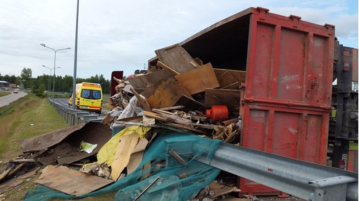 Treileris apgāžas un aizrauj līdzi mašīnu (+ VIDEO)