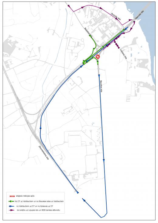 Slēgta satiksme Jāņa Čakstes gatves un Bauskas ielas krustojuma rotācijas aplī (+ karte)