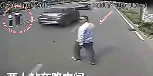 Redzēdams, ka divas mazas meitenes iestrēgušas blīvas satiksmes vidū, autobusa vadītājs aptur savu spēkratu un dodas bērniem palīgā.