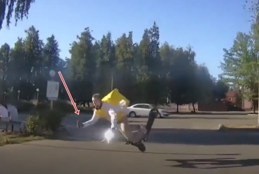 Elektroskrejriteņa vadītājs krīt auto signāltaures "uzmodināts", taču diezin vai būtu labāk, ja puisis būtu uztriecies pretimbraucošajam transportam.