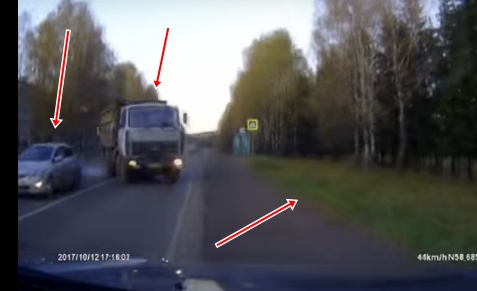 Lai izvairītos no sadursmes, video autors spiests iebraukt grāvī. Visi notikumi līdz 0:22 (tālāk tikai lamu vārdi).