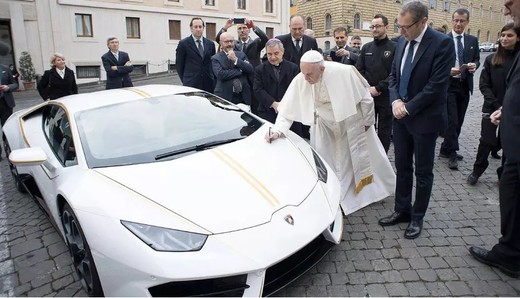 Vatikāna karoga baltajās krāsās krāsoto varenauto Lamborghini kompānija Franciskam uzdāvināja pērnā gada novembrī. Huracan nogādāja uz pāvesta pastāvīgo dzīvesvietu – Vatikāna viesnīcu St.Martha`s House, kur pāvests to svētīja un atstāja autogrāfu uz motora pārsega. Uzreiz pēc tam ekskluzīvo kupeju pārdeva izsolē, bet iegūtos līdzekļus – 809 375 eiro - nodeva organizācijām, kas nodarbojas ar kristiešu baznīcu un īpašumu atjaunošanu Irākā, palīdz sievietēm migrantēm un sniedz medicīnisko palīdzību Āfrikas iedzīvotājiem.