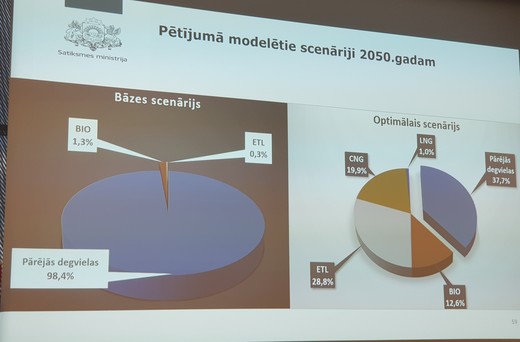 SM izstrādājusi divus attīstības scenārijus 2050.gadam. Bāzes scenārijs paredz, ka līdz šim laikam Latvijā ar biodegvielu brauks 1,3%, ar ETL 0,3%, bet pārējo degvielu īpatsvars sasniegs 98,4%. Optimālais cenārijs gan būtu pavisam savādāks, proti: ar LNG un CNG brauktu attiecīgi 1 un 19,9%, ar biodegvielu 12,6%, ETL izmantotu 28,8%, bet pārējās degvielas - 37,7%.