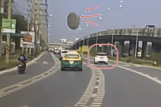 Vadītājs Taizemē piedzīvo nepatīkamu pārsteigumu, kad kaut kāda nezināmas konstrukcijas sastāvdaļa negaidot nogāžas viņa automašīnas priekšā.