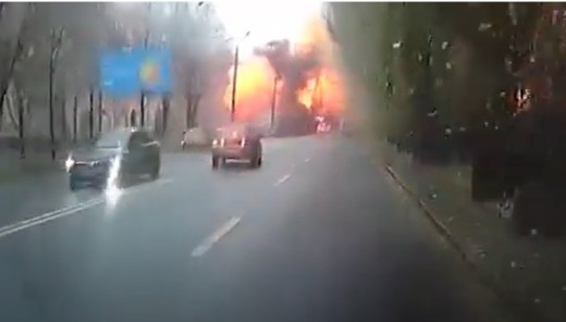 Lūk, šādi izskatās Krievijas raķešu trieciens Dņipro pilsētas centram, ko fiksējis kāda autovadītāja mašīnas salonā ievietotais video reģistrators.