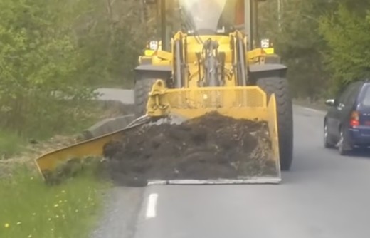 Greideris, kas braucot uz vienu pusi noņem ceļa apmales apaugumu, bet atgriežoties izlīdzina noņemto kārtu un sastumj to atpakaļ, šajā gadījumā aizvietots ar traktoru, kas apauguma slāni noņem ar speciālu kausu un kad tas pilns, ieber saturu automašīnā.