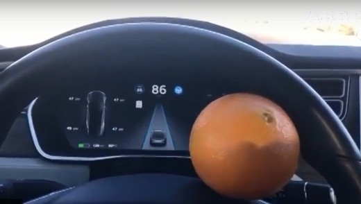 Saskaņā ar instrukciju, aktivizētas autonomās braukšanas sistēmas laikā vadītāja rokām jābūt uz stūres, taču izrādās, ka smalko sistēmu var samērā vienkārši apmānīt. Šim nolūkam starp stūres aplodu un centru jāiespiež apelsīns un vadītāja rokas ir brīvas, bet mašīna braukt, kur tai norādīts.