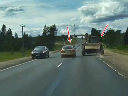 Vieglā auto vadītājs seko lēngaitas traktoram ilgu laiku, taču beigās tomēr zaudē pacietību un "viegli taranē" piekabes riteni.