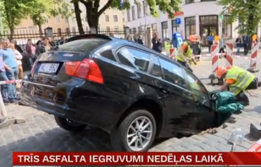 Ūdens izskalots tukšums, iegruvis asfalts un ceļa segumā ielūzis auto. Šāda aina pēdējās nedēļas laikā Rīga pieredzēta jau trīs reizes.