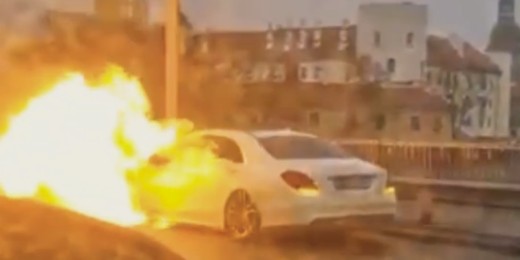 Acīmredzot, kāda tehniska iemesla dēļ uz Vanšu tilta Rīgā aizdedzies S-klases Mercedes.