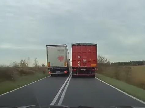 Kravas auto vadītājs uzsāk apdzīšanu, taču viņa kolēģis labajā joslā izliekas to neredzam.