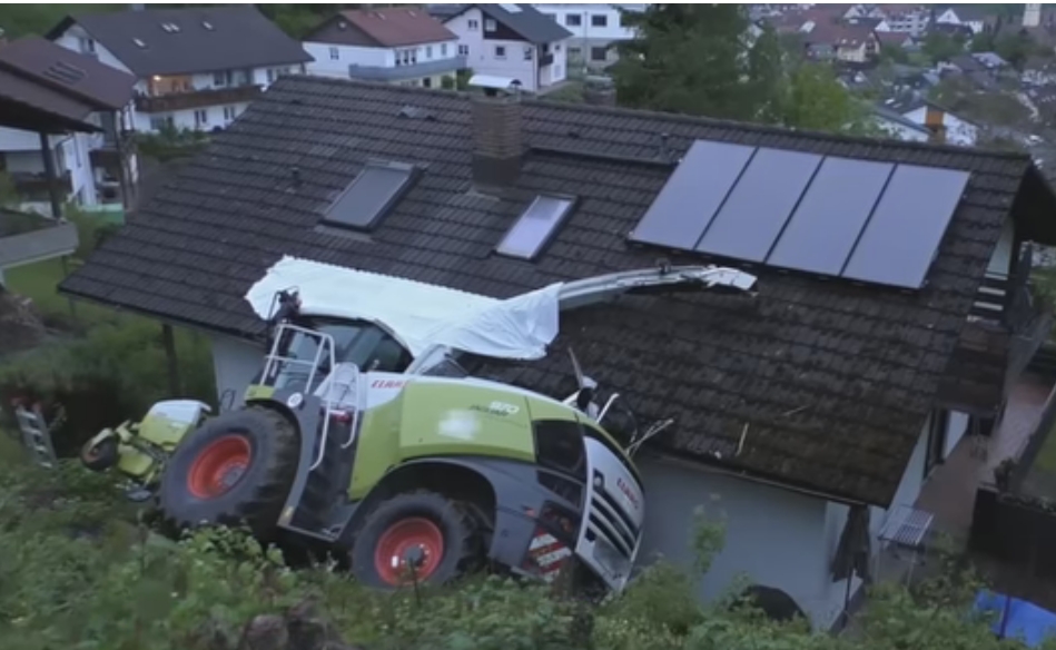 Vācijā siena smalcinātājs uzgāžas mājai (+ VIDEO)